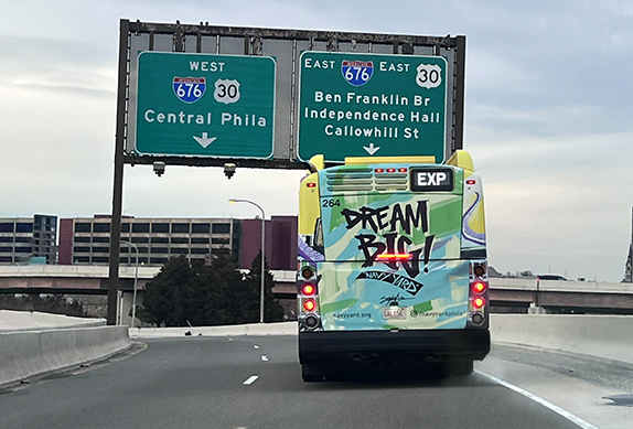 Beyond its bold color palette, Dream Big is layered with meaningful imagery that reflects both Philadelphia and the Navy Yard’s identity. The Philadelphia skyline rises in the background alongside the iconic Navy Yard gates—symbolizing the physical and symbolic connection the shuttle provides between Center City and the innovation unfolding on campus. Look closer and you’ll discover thoughtful details woven throughout the design: a Sea Monster nodding to the Navy Yard’s first public art installation with Group X; a naval ship bearing the hull number “215,” a tribute to the local area code; and the distinctive curve of 1200 Intrepid, designed to echo the form of a battleship. Together, these elements weave the city’s history, creativity, and forward momentum into a moving tribute that quite literally carries Philadelphia’s story forward.