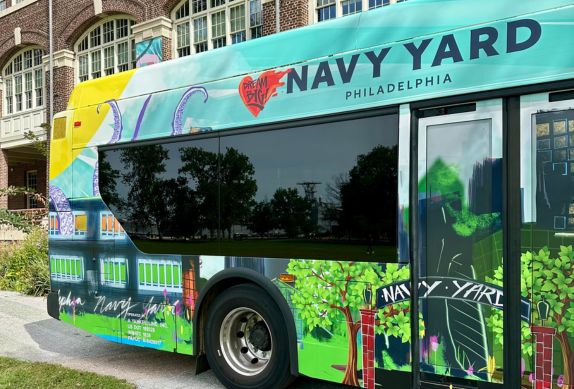 The buses travel along two key routes connecting the Navy Yard to Center City and to NRG Station on the Broad Street Subway Line, providing employees and visitors with easy access to campus. Now, in addition to offering a convenient ride, they deliver something more: a reminder that creativity fuels progress.