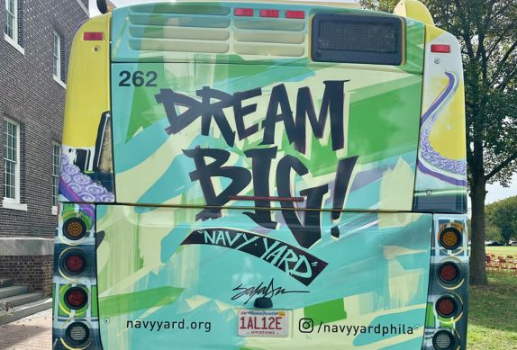 Dream Big is a mobile art project transforming the Navy Yard transit shuttle buses into vibrant, rolling works of art. Created by acclaimed Philadelphia artist King Saladeen, these buses now serve as “moving canvases” bringing bold color, imagination, and inspiration to the daily commute.